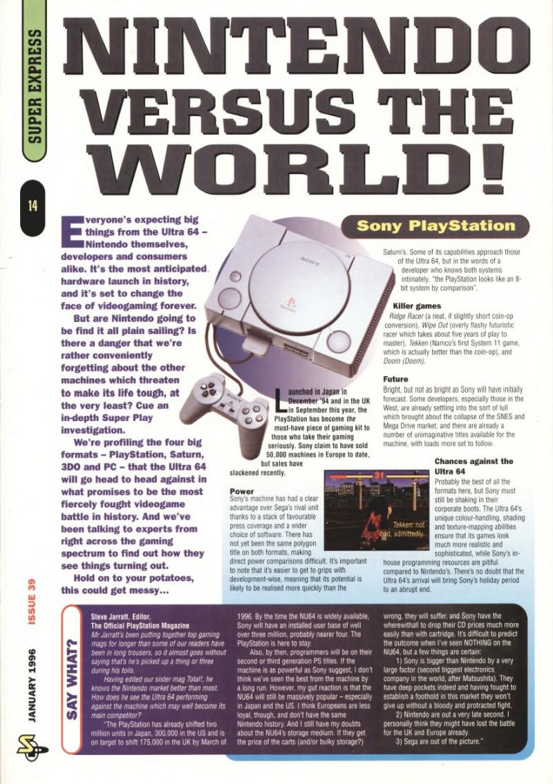 Everyone's expecting big things from the Ultra 64 - Nintendo themselves, developers and consumers alike. But are Nintendo going to be find it all plain sailing? We're profiling the four big formats - PlayStation, Saturn, 3DO and PC - that the Ultra 64 will go head to head against in what promises to be the most fiercely fought videogame battle in history.